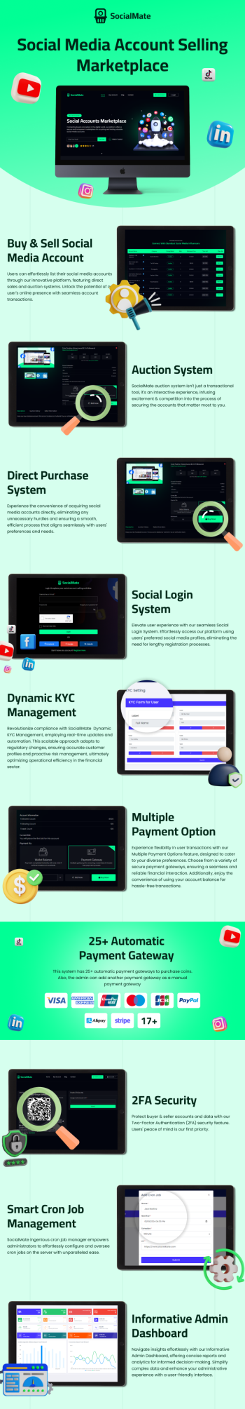 SocialMate is a secure, ready-to-launch marketplace for buying and selling social media accounts. It features dynamic bidding, quick purchases, multiple payment options, and social logins, all backed by strong security like encryption, OTP, and email/SMS alerts. Built to save time and cost, SocialMate lets you launch a professional account-trading platform fast and safely.